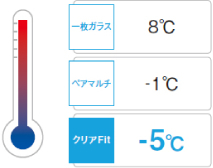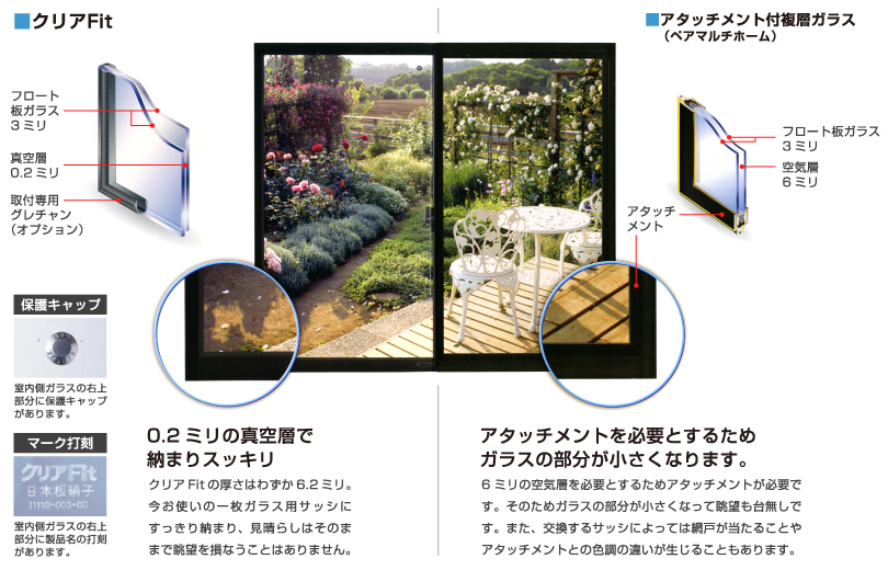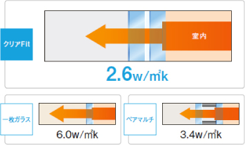 クリアFitの断熱性能は一枚ガラスの2倍以上。室内の暖かさを保ちます。アタッチメント付複層ガラス(当社製品:ペアマルチホーム)は網戸が当たる場合は6ミリ幅の空気層を狭めることになりますので、さらに性能が低下してしまいます。